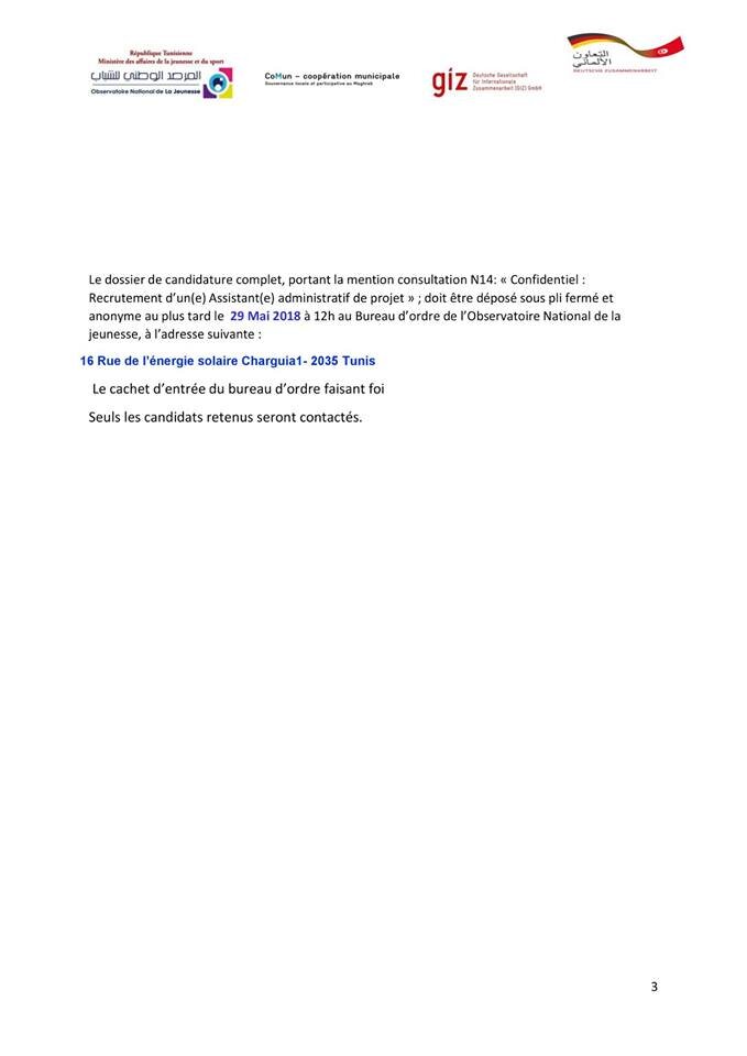 | Objet : recrutement d’un(e) consultant administratif(ve) pour le projet cadre tuniso-allemand ‘lappui aux institutions de jeunes . Les offre doivent parvenir à l’adresse suivante : observatoire national de la jeunesse -16 rue de l’energie solaire-zone industrielle charguia 1-2035-tunis date limite le 21 mai 2018 a midi 12 h |