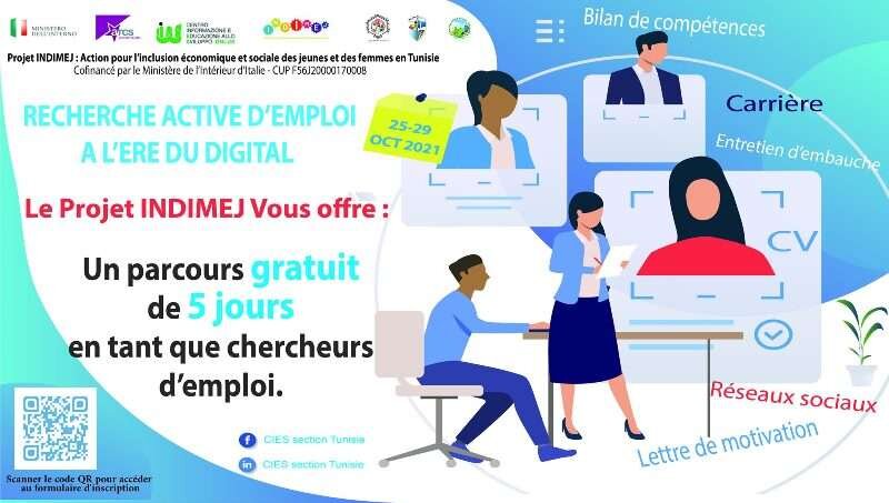 - Dans le cadre du projet « INDIMEJ», les partenaires CIES Tunisie et les municipalités de Ras Jebal et El Alia vous offrent une formation gratuite en ligne sur les techniques de recherche d’Emploi à l’ère du digital.