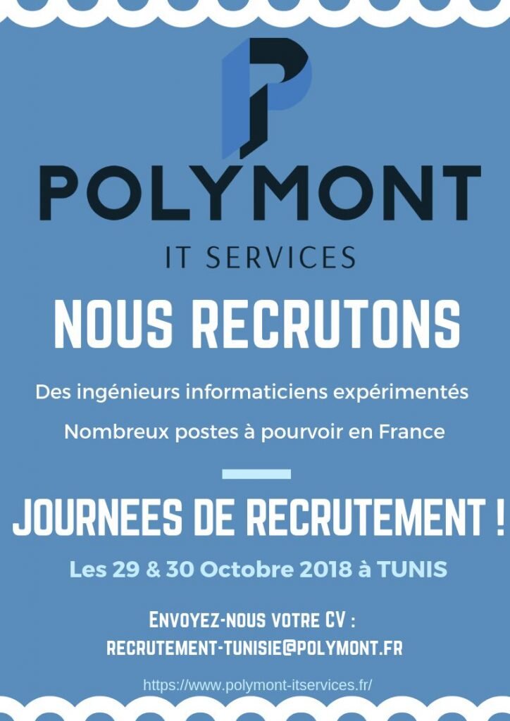 Polymont IT Services [journée de recrutement] Event S’abonner à notre NEWSLETTER Recevoir tous les offres d'emploi ✅ Regarder la chaine à Recruter.TV Un poste en France, ça vous tente ? Profitez-en, les équipes Polymont IT Services se déplacent en Tunisie les 29 et 30 octobre prochains pour vous rencontrer et vous proposer des missions sur toute la France ! S’abonner à notre NEWSLETTER Recevoir tous les offres d'emploi ✅ Regarder la chaine à Recruter.TV Envoyez nous vos candidatures à l’adresse suivante : S’abonner à notre NEWSLETTER Recevoir tous les offres d'emploi ✅ Regarder la chaine à Recruter.TV [email protected] Partager : Cliquez pour partager sur Facebook(ouvre dans une nouvelle fenêtre) Facebook Cliquez pour partager sur LinkedIn(ouvre dans une nouvelle fenêtre) LinkedIn Plus Cliquer pour partager sur X(ouvre dans une nouvelle fenêtre) X Cliquer pour envoyer un lien par e-mail à un ami(ouvre dans une nouvelle fenêtre) E-mail Cliquez pour partager sur WhatsApp(ouvre dans une nouvelle fenêtre) WhatsApp Facebook