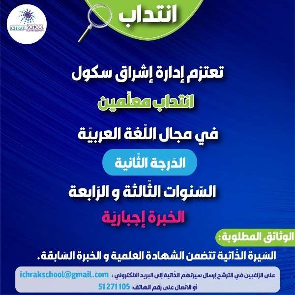 Pour postuler, envoyez votre CV et votre lettre de motivation par e-mail à ichrakschool@gmail.com
