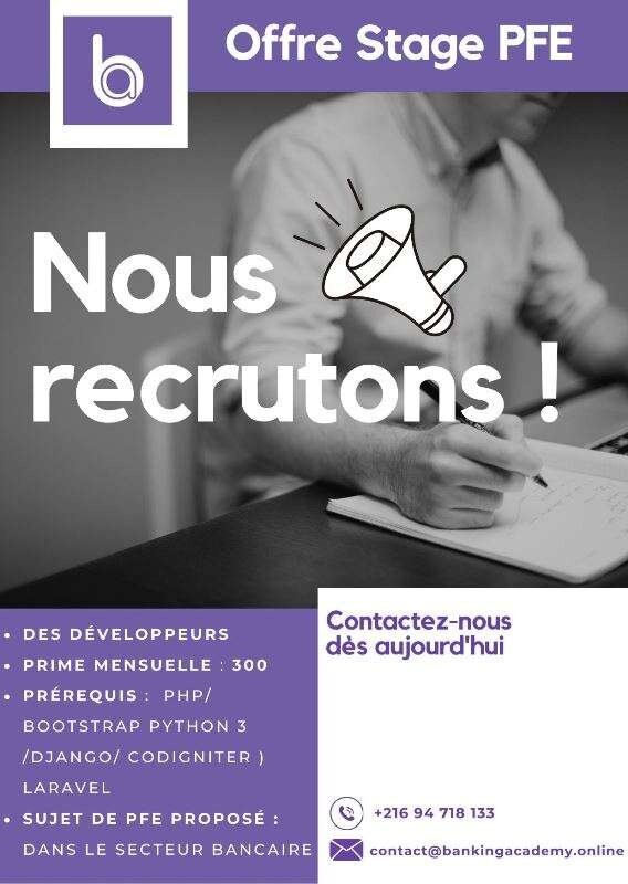 Banking Academy ouvre ses portes aux étudiants à la recherche de stages PFE dans le du développement web et du développement mobile.
