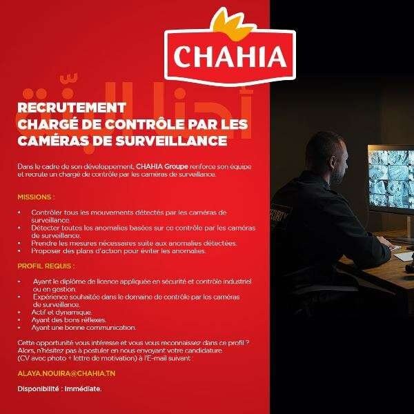 CHAHIA groupe est actuellement à la recherche d’un chargé de contrôle par les caméras de surveillance pour renforcer notre équipe.