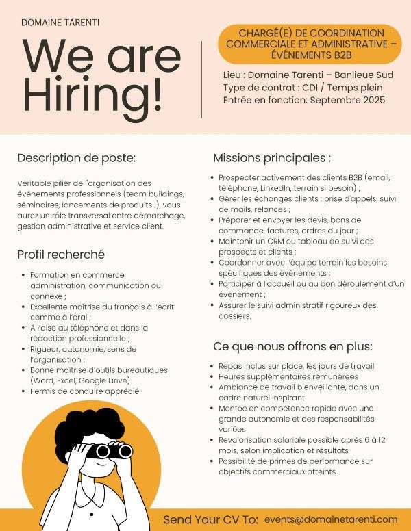 Pour postuler, envoyez votre CV et votre lettre de motivation par e-mail à events@DomaineTarenti.com