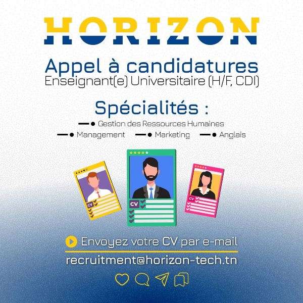 Pour postuler, envoyez votre CV et votre lettre de motivation par e-mail à recruitment@horizon-tech.tn
