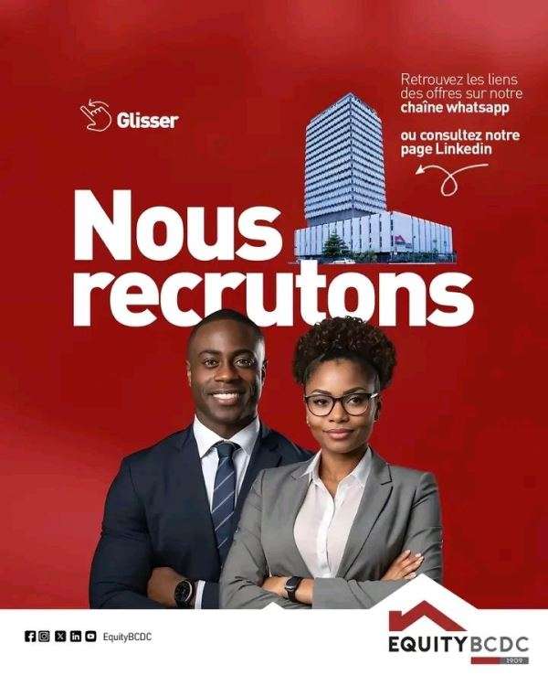 Pour postuler, envoyez votre CV et votre lettre de motivation par e-mail à recruitment@equitybcdc.cd