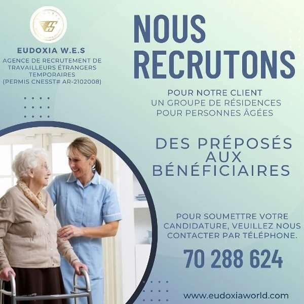- Une résidence pour personne âgées établie au Québec, recherche actuellement des préposé(e)s aux bénéficiaires pour rejoindre son équipe.