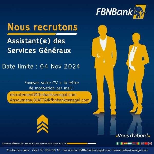 ✅ Expérience professionnelle de deux (02) à trois (03) ans dans une fonction similaire dans une banque, une compagnie d’Assurance…