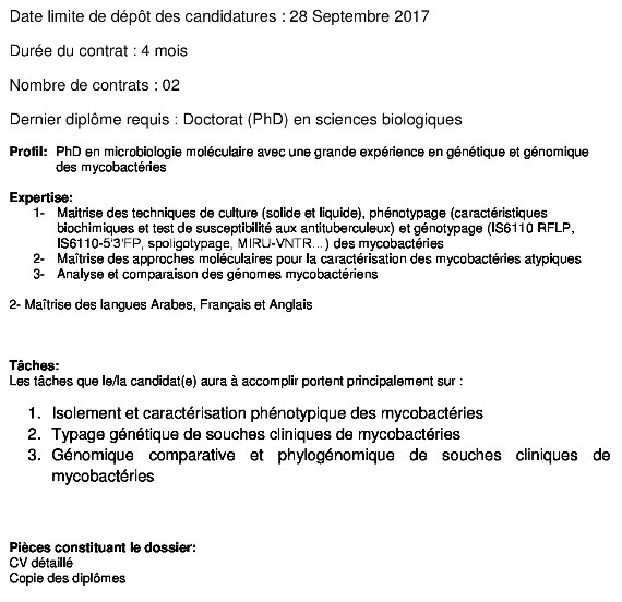 Contrat Post-Doc en génétique et génomique mycobactérienne pour les besoins de l’Unité de Typage et Génétique des Mycobactéries dans le cadre dans le cadre des activités du Centre d’Investigation clinique de l’IPT « Maladies transmissibles : histoire naturelle et outils innovants pour le diagnostic, la prévention et le traitement »