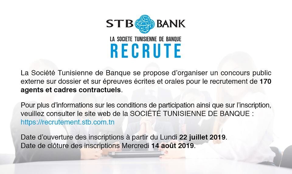 La Société Tunisienne de Banque se propose d’organiser un concours public externe sur dossier et sur épreuves écrites et orales pour le recrutement de 170 agents et cadres contractuels selon les spécialités suivantes et conformément aux conditions bien définies. L’inscription se fait en ligne et par le biais de la présente plateforme