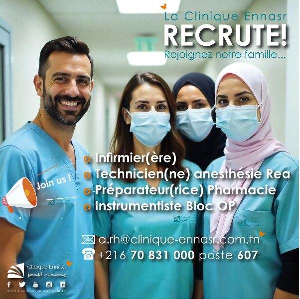 Pour postuler, envoyez votre CV et votre lettre de motivation par e-mail à a.rh@clinique-ennasr.com.tn