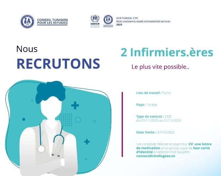 Dans le cadre de la mise en œuvre du projet « Basic assistance needs and essential services » pour l’année 2023, objet de partenariat avec le Haut-Commissariat des Nations Unies pour les Réfugiés, le Conseil Tunisien pour les Réfugiés lance une offre d’emploi pour le recrutement de deux (2) infirmiers.ères.