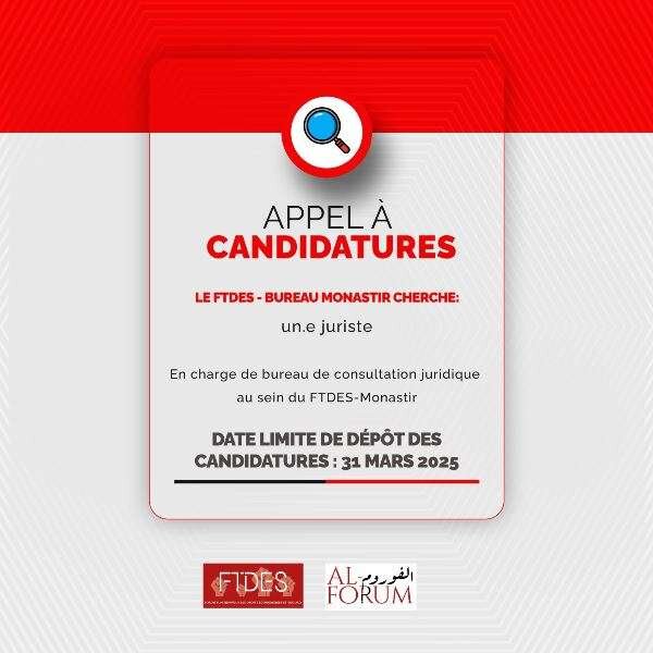 Le FTDES recrute un.e Juriste pour intégrer son bureau à Monastir et renforcer ses actions en faveur des droits économiques et sociaux en Tunisie.