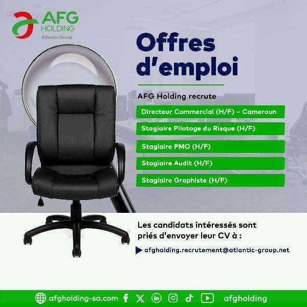 Pour postuler, envoyez votre CV et votre lettre de motivation par e-mail à afgholding.recrutement@atlantic-group.net