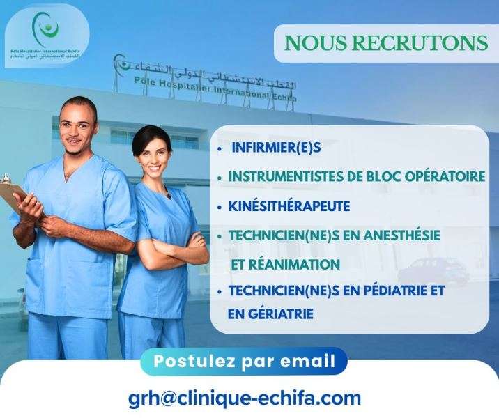 Pour postuler, envoyez votre CV et votre lettre de motivation par e-mail à grh@clinique-echifa.com