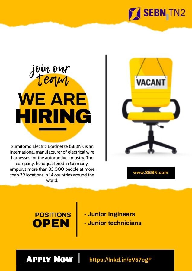 Démarrée en 2019, SEBN TN2 est une multinationale filiale du groupe Sumitomo Bordnedze, installée en Tunisie (Néopark El Fejja, Mornaguia, Manouba) et spécialisée dans la fabrication des faisceaux électriques pour l’industrie automobile, exclusivement pour le groupe Volkswagen.