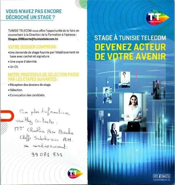 Chères étudiantes et chers étudiants de l’ISGB, Tunisie Telecom vous ouvre ses portes pour un stage exceptionnel au sein de ses établissements. Rejoignez un leader des télécommunications et enrichissez votre parcours dans un environnement innovant et stimulant.