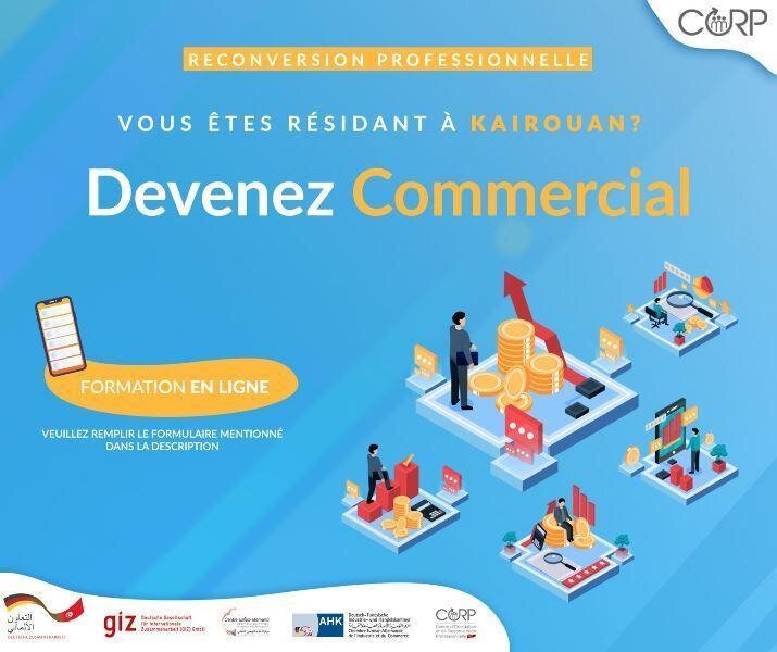 Dans le cadre du projet « Migration For Development » pour l’année 2021, le Centre d’Orientation et de Reconversion professionnelle organise une formation de reconversion professionnelle vers le métier de Commercial pour les chercheurs d’emploi résidants à Kairouan. Cette reconversion professionnelle se fera en ligne, postulez sans plus tarder !