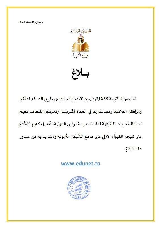 Le résultat de l’acceptation initiale de tous les candidats au choix des bourses par contrat d’assistants pour encadrer, accompagner et aider les élèves dans la vie scolaire et les enseignants à les contracter pour combler les lacunes circonstancielles au profit de l’école internationale de Tunis