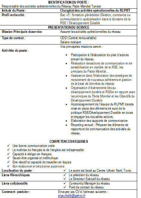 Recrutement / Responsable Actualités, Annonces Recrutement Responsable des activités opérationnelles du Réseau Local Pacte Mondial Tunisie Partager : Cliquez pour partager sur Facebook(ouvre dans une nouvelle fenêtre) Facebook Cliquez pour partager sur LinkedIn(ouvre dans une nouvelle fenêtre) LinkedIn Plus Cliquer pour partager sur X(ouvre dans une nouvelle fenêtre) X Cliquer pour envoyer un lien par e-mail à un ami(ouvre dans une nouvelle fenêtre) E-mail Cliquez pour partager sur WhatsApp(ouvre dans une nouvelle fenêtre) WhatsApp Facebook