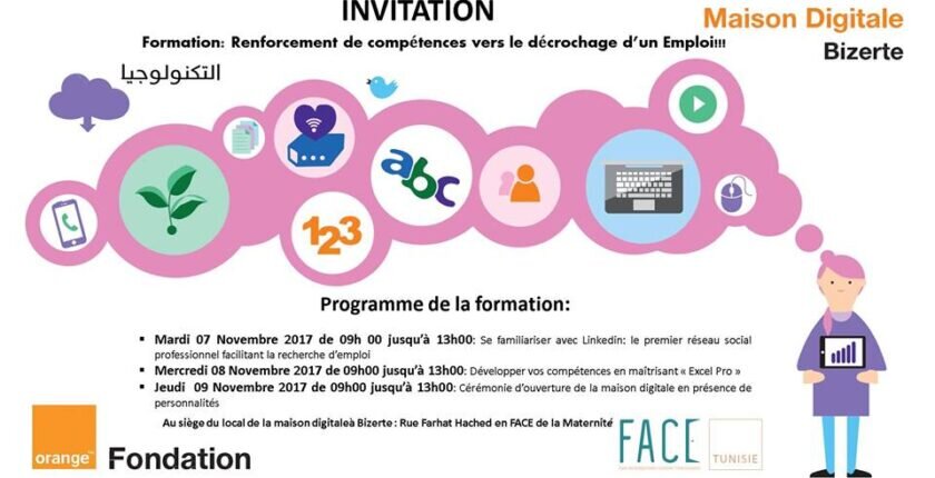 FACE Tunisie continue à vous soutenir dans votre quête de recherche d’emploi et vous invite à la session de formation de 3 jours vous aidant à approfondir vos compétences et qui se tiendra à Bizerte le 07-08-09 Novembre 2017 de 09 à 13h00