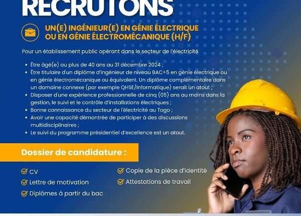 Read More📣 Annonce recrutement Le cabinet AfricSearch Togo recrute un(e) Ingénieur(e) en Génie Electrique ou en Génie Electromécanique (H/F) pour le compte d’un établissement public opérant dans le secteur de l’électricité….