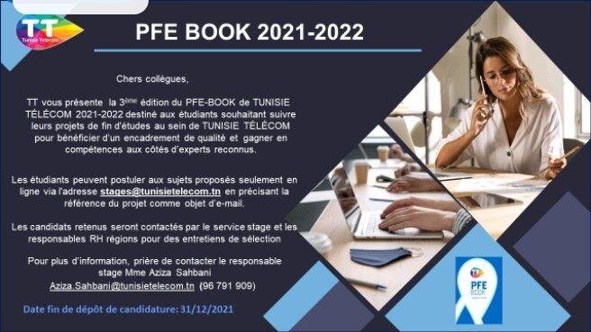 « TUNISIE TÉLÉCOM, entreprise socialement responsable et engagée encourageant l’échange et le partage entre l’entreprise et les organismes universitaires,a l’honneur de vous présenter ci joint la 3èmeédition de son PFE-BOOK TT-PFE-BOOK 21-22 destiné aux étudiants souhaitant suivre leurs projets de fin d’études au sein del’entreprise pour bénéficier d’un encadrement de qualité et gagner en compétences aux côtés d’experts reconnus.