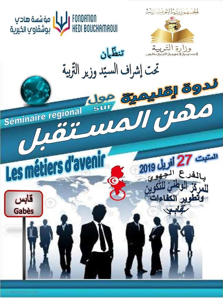 La Fondation Hédi Bouchamaoui organise, en collaboration avec le Ministère de l’Education, un séminaire sur « Les métiers d’avenir » qui s’adresse essentiellement aux bacheliers et aux étudiants, mais aussi aux professionnels de l’orientation scolaire et universitaire, sera organisé le samedi 27 avril 2019 à la section régionale du Centre National de Formation et de Promotion des Compétences de Gabès (ancien CREFOC).