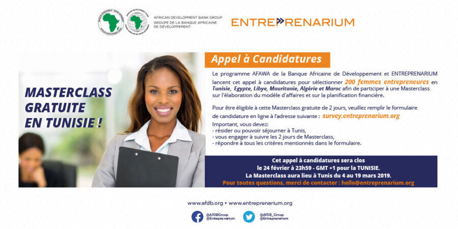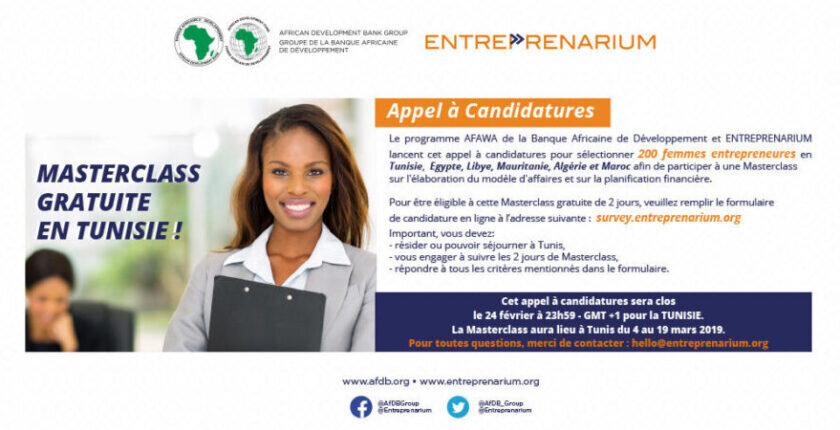 La banque Africaine de développement et ENTREPRENARIUM lancent une formation MASTERCLASS pour 200 femmes entrepreneuses de la région Afrique du nord.