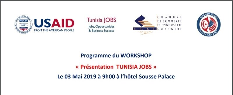 La Chambre de Commerce Tuniso-Américaine du Centre (AmchamTunisia Center Chapter) en collaboration avec la Chambre de Commerce d’Industrie du Centre et USAID-Tunis vous invitent à prendre part au Workshop sur la Présentation de TunisaJOBS le Vendredi 03 Mai 2019 à l’hôtel Sousse-Palace ; un programme USAID doté de 60 millions de dollars et œuvrant à la création d’emplois pour les jeunes à travers l’appui aux entreprises du secteur privé.
